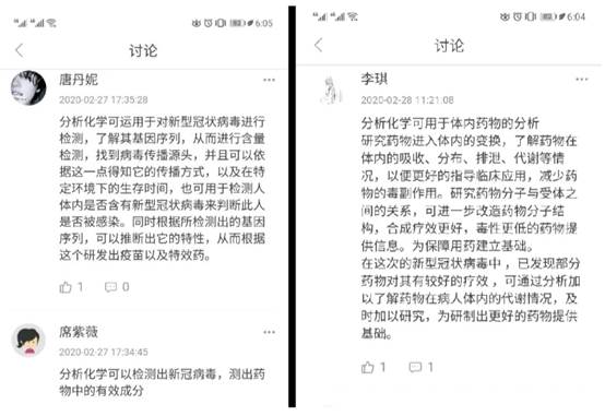 课程团队积极探索线上教学技术手段的同时,创新“虚拟”课堂教学新模式,将线上教学赋予课程价值引领功能,不断拓展和创新课程思政新路径。喻德忠教授在线上讲授绪论时,结合新冠肺炎疫情,讨论了分析化学在药物及病毒检测中的应用,并安排学生查阅相关资料,了解相关知识。郑石老师在线上教学平台发布了“分析化学在生产生活中有哪些应用?”大讨论,学生们在讨论中不知不觉的联系到当前疫情,就分析化学如何解决实际问题,特别是对于疫情控制的作用展开讨论,同时延伸到药物分析等方向。大富豪