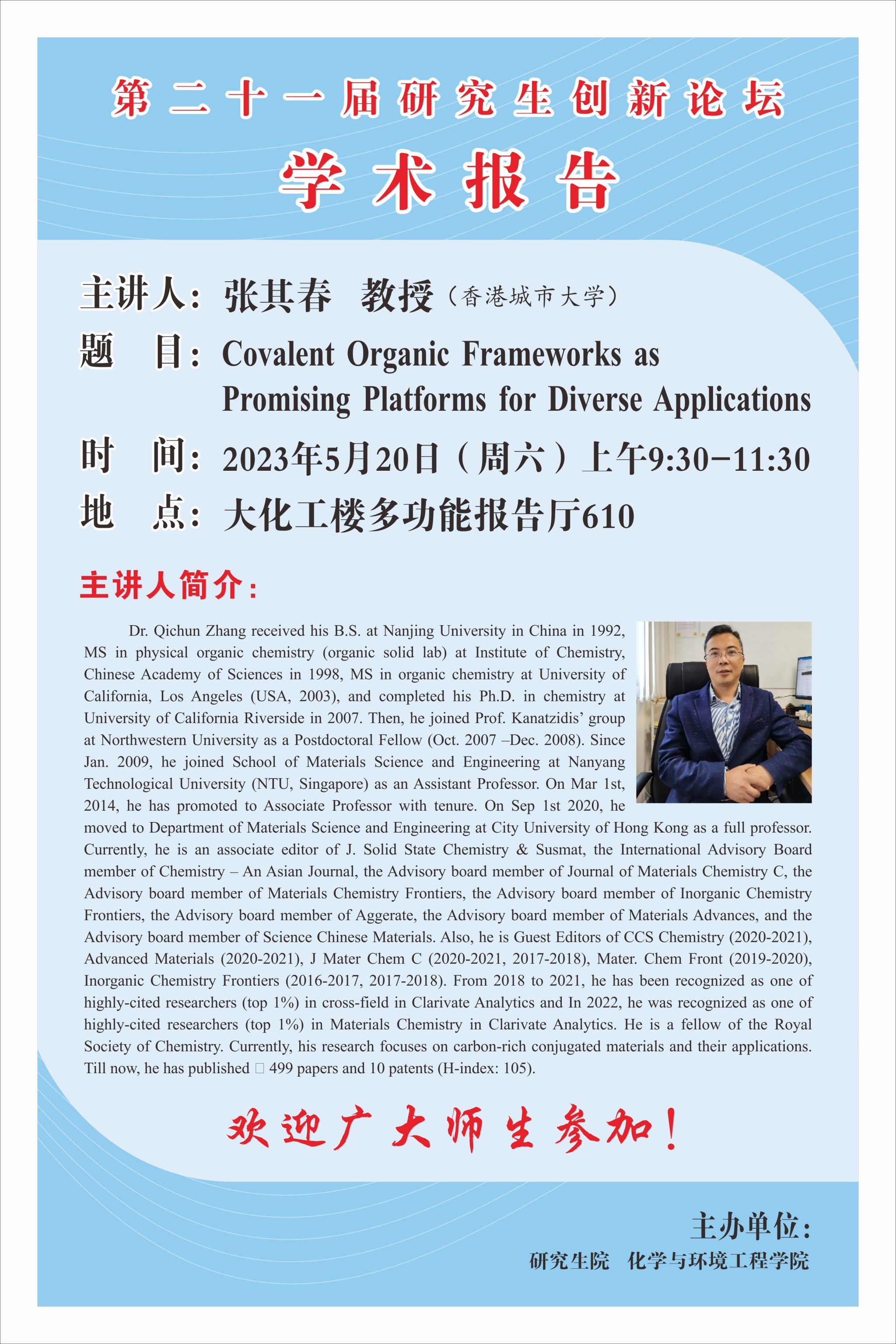 【第二十一届研究生创新论坛学术报告】Covalent Organic Frameworks as Promising Platforms for Diverse Applications 作者:发布时间:2023-05-20点击率: